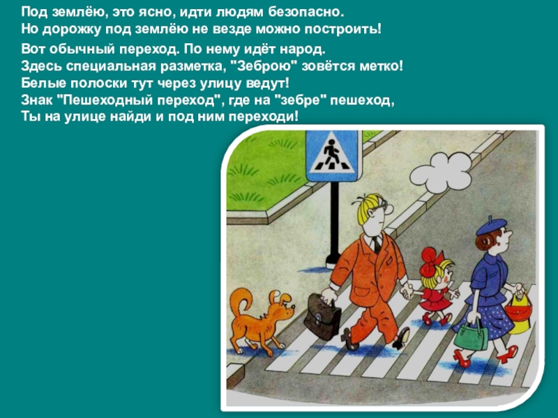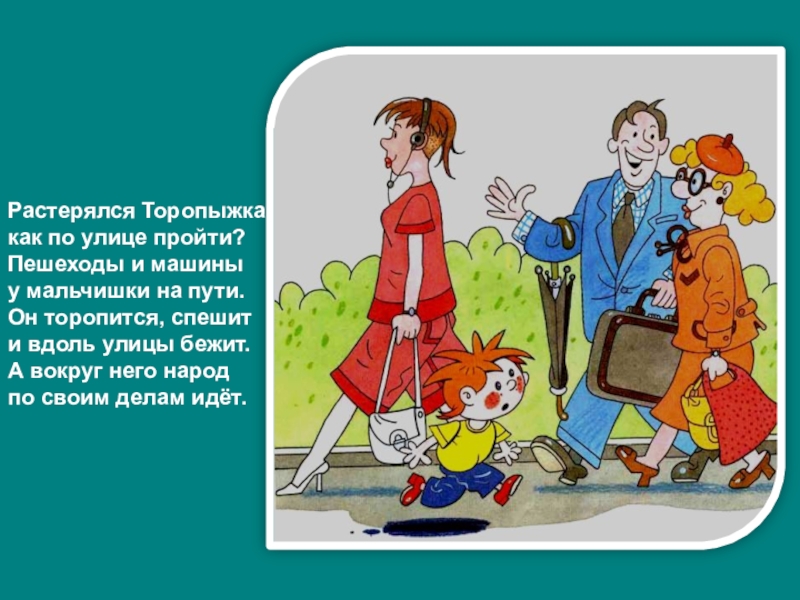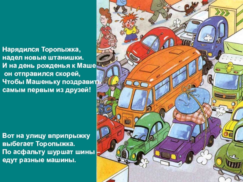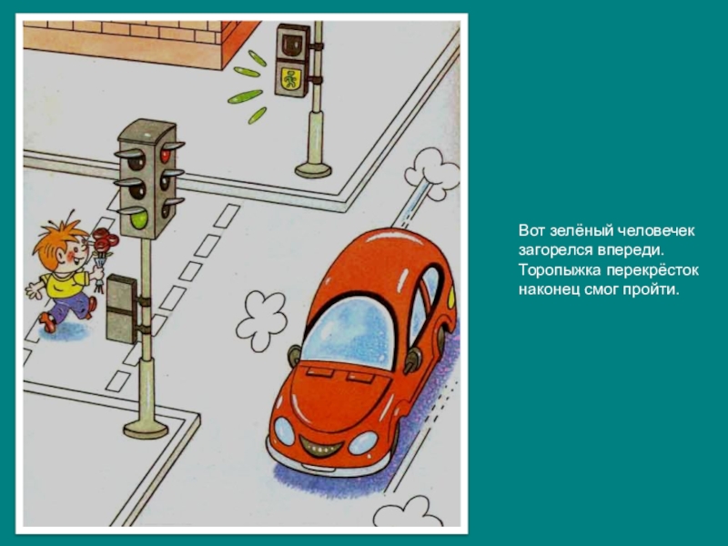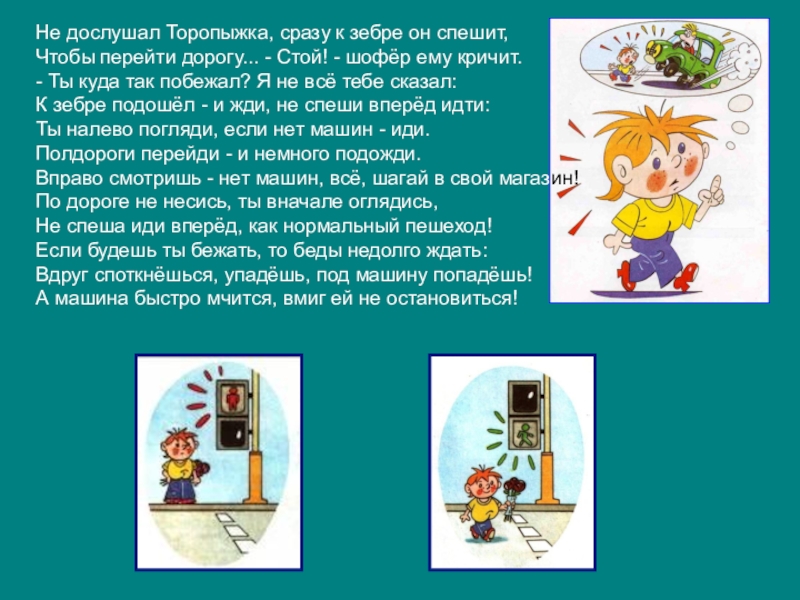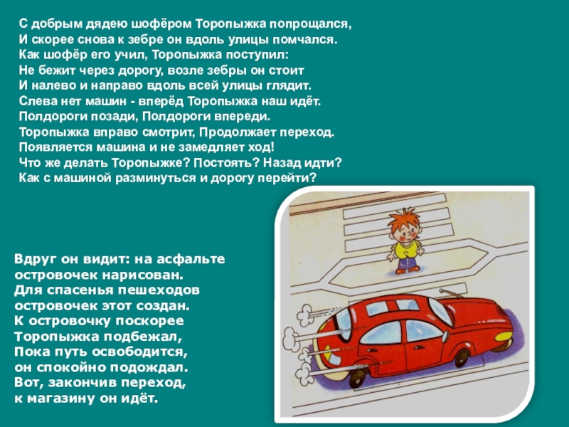 Слева нет машин - вперёд Торопыжка наш идёт.
