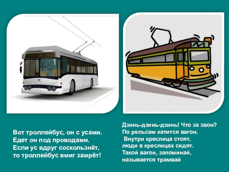 Слайд 7Вот троллейбус, он с усами. Едет он под проводами.