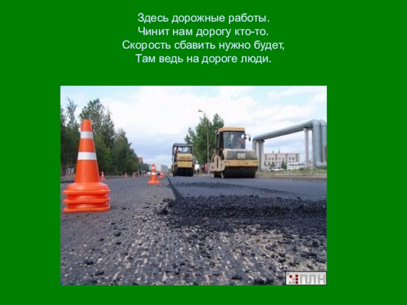 Слайд 14Здесь дорожные работы. Чинит нам дорогу кто-то. Скорость сбавить нужно будет, Там ведь на