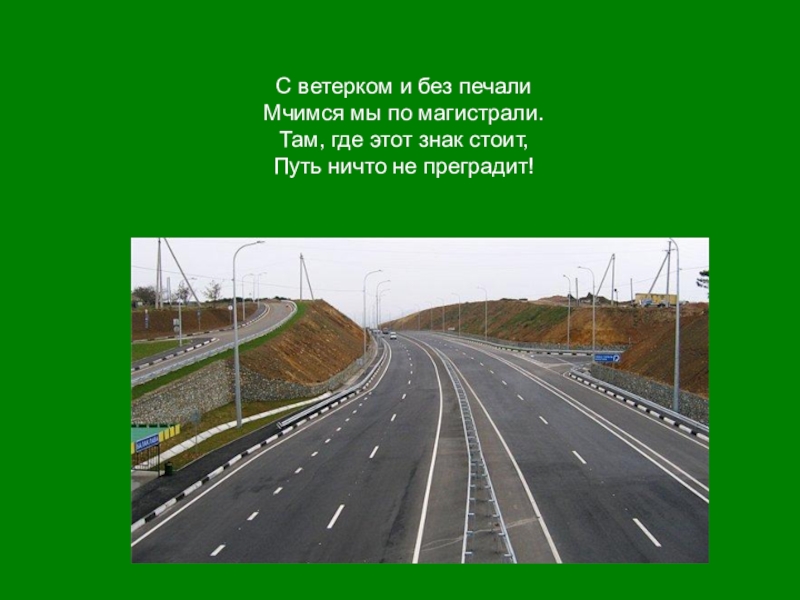 Слайд 2С ветерком и без печали Мчимся мы по магистрали. Там, где этот знак