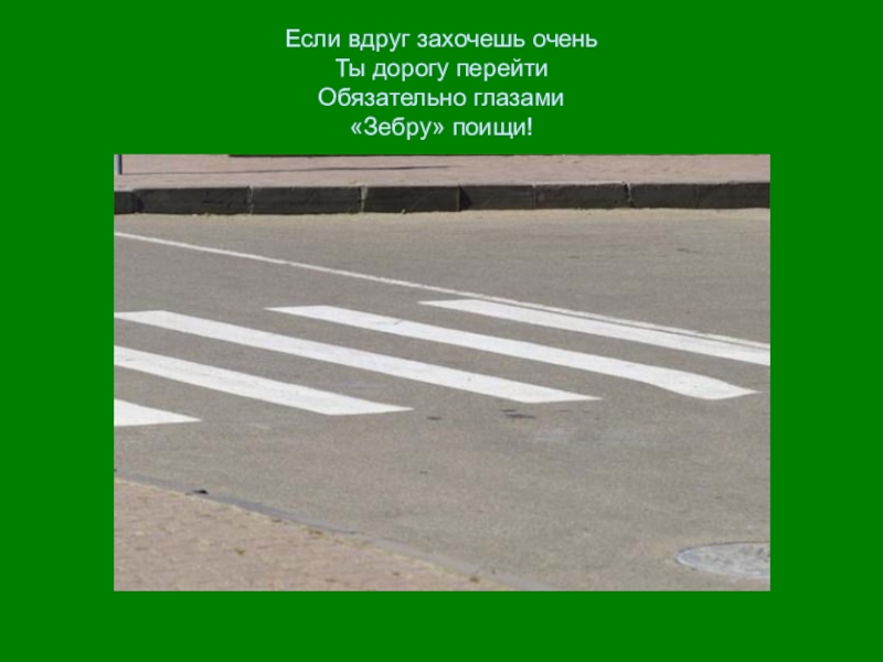 Если вдруг захочешь очень Ты дорогу перейти Обязательно глазами «Зебру» поищи!