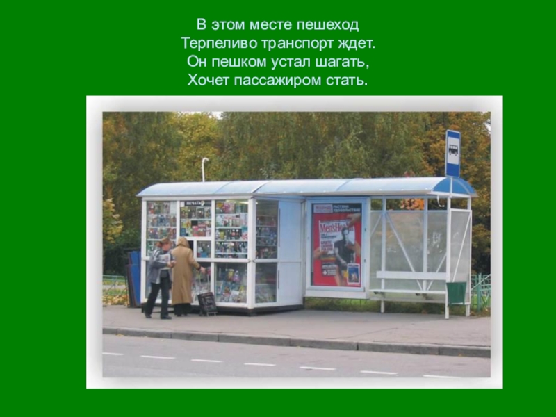 Слайд 10В этом месте пешеход Терпеливо транспорт ждет. Он пешком устал шагать, Хочет пассажиром стать.
