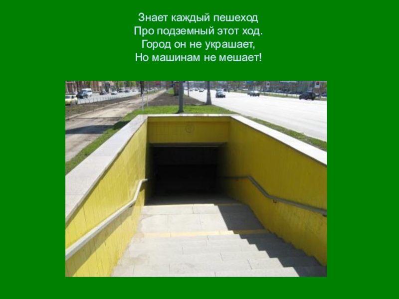 Слайд 8Знает каждый пешеход Про подземный этот ход. Город он не украшает, Но машинам не