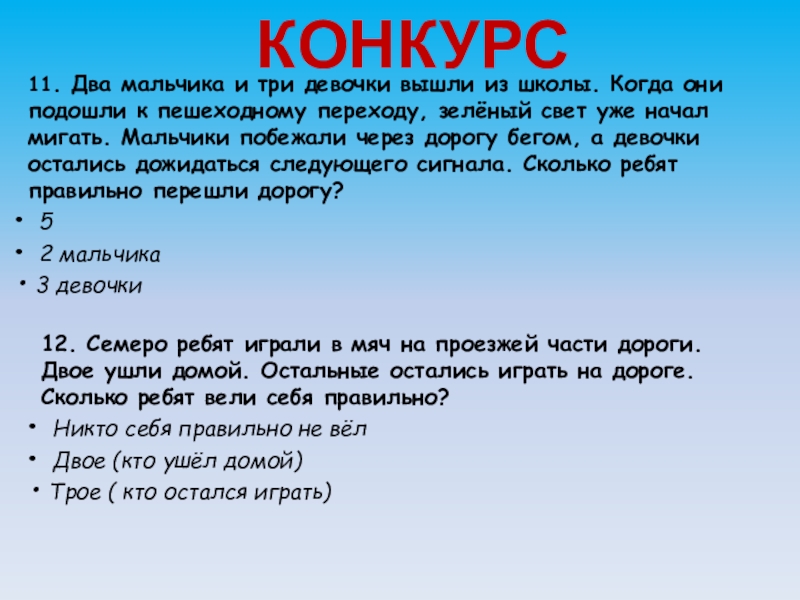 12. Семеро ребят играли в мяч на проезжей части дороги. Двое ушли домой. Остальные остались играть на дороге. Сколько ребят вели себя правильно?