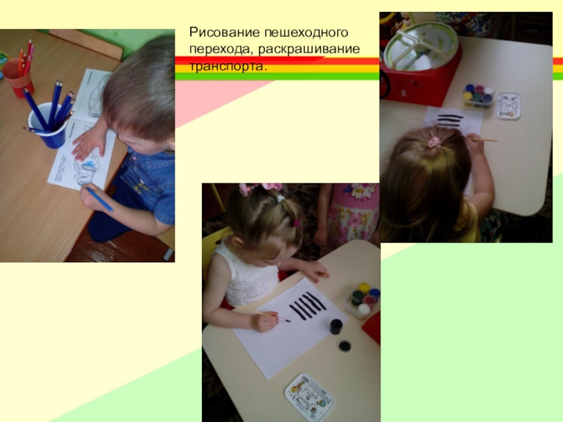 Слайд 8Рисование пешеходного перехода, раскрашивание транспорта.