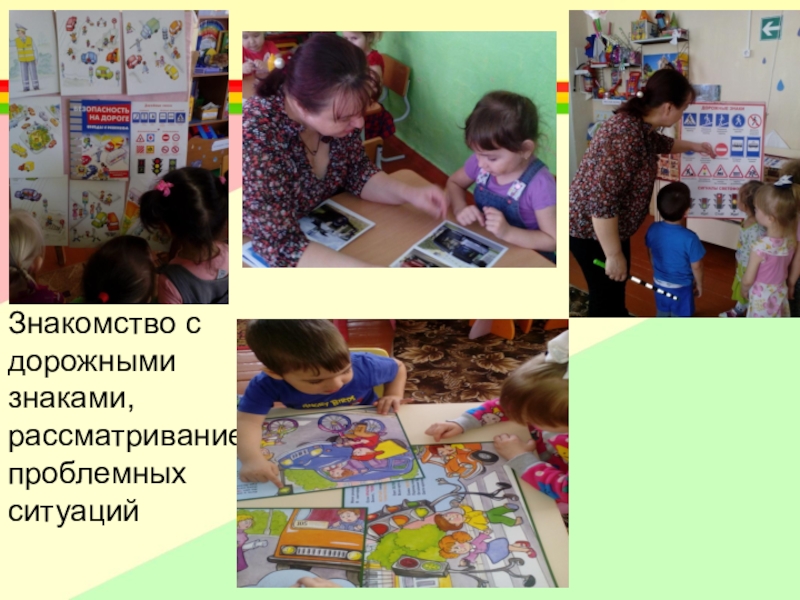 Слайд 7Знакомство с дорожными знаками, рассматривание проблемных ситуаций