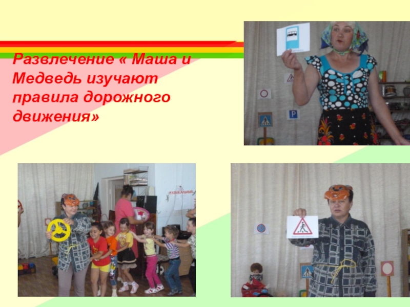 Слайд 10Развлечение « Маша и Медведь изучают правила дорожного движения»