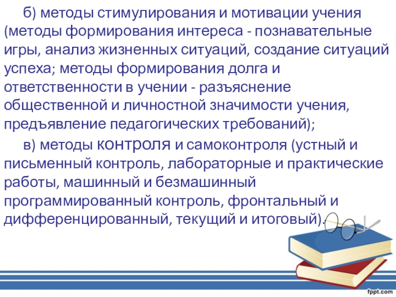 а) методы организации и осуществления учебной деятельности (словесные, наглядные, практические, репродуктивные и проблемные, индуктивные и дедуктивные, самостоятельной работы и работы под руководством преподавателя);