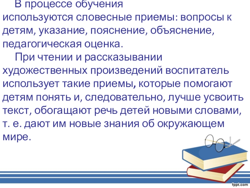 Слайд 11В процессе обучения используются словесные приемы: вопросы к детям, указание, пояснение, объяснение,
