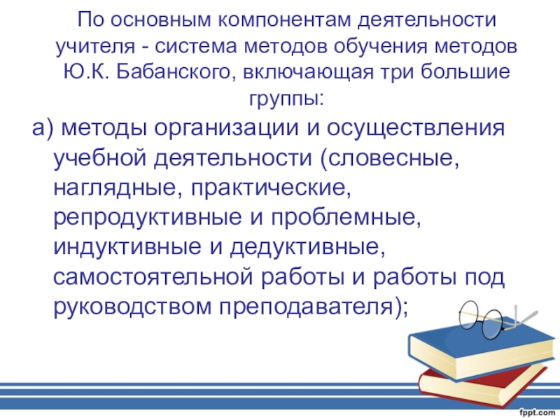 Слайд 15По основным компонентам деятельности учителя - система методов обучения методов Ю.К. Бабанского, включающая три большие