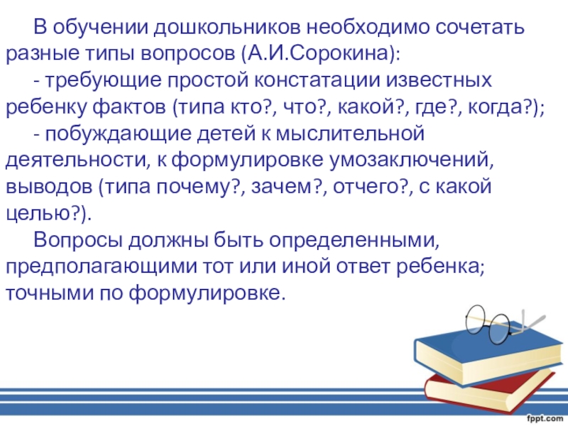 Слайд 13В обучении дошкольников необходимо сочетать разные типы вопросов (А.И.Сорокина):