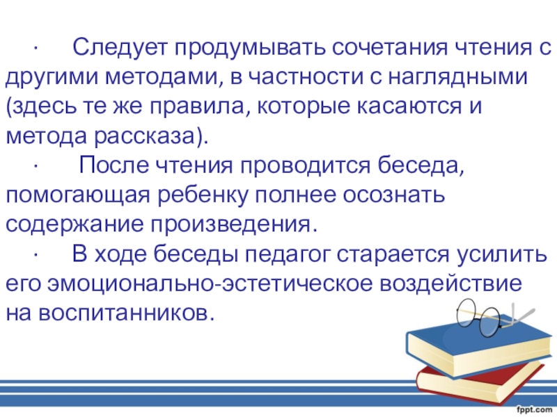 Слайд 10· Следует продумывать сочетания чтения с другими методами, в частности с наглядными