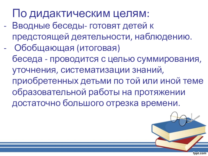 беседа - проводится с целью суммирования, уточнения, систематизации знаний, приобретенных детьми по той или иной теме образовательной работы на протяжении достаточно большого отрезка времени.