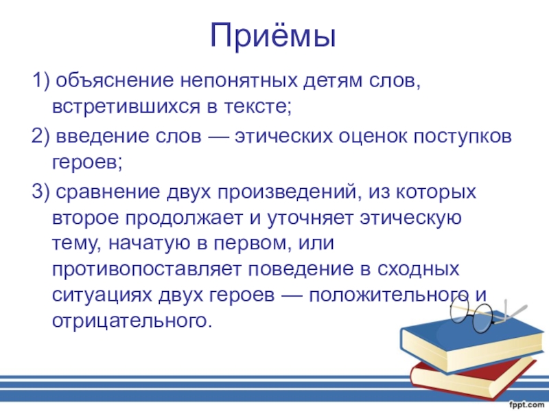 1) объяснение непонятных детям слов, встретившихся в тексте;
