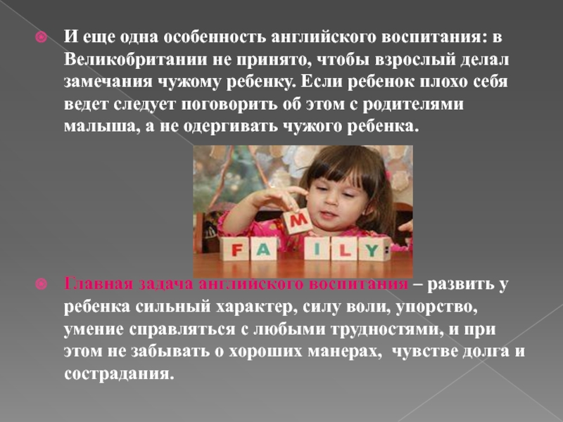 Слайд 15И еще одна особенность английского воспитания: в Великобритании не принято, чтобы