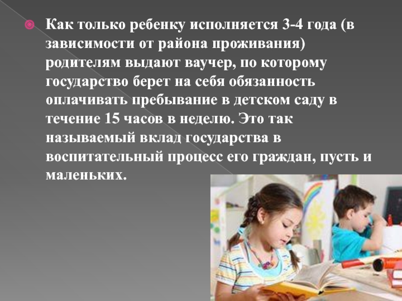 родителям выдают ваучер, по которому государство берет на себя обязанность оплачивать пребывание в детском саду в течение 15 часов в неделю. Это так называемый вклад государства в воспитательный процесс его граждан, пусть и маленьких.