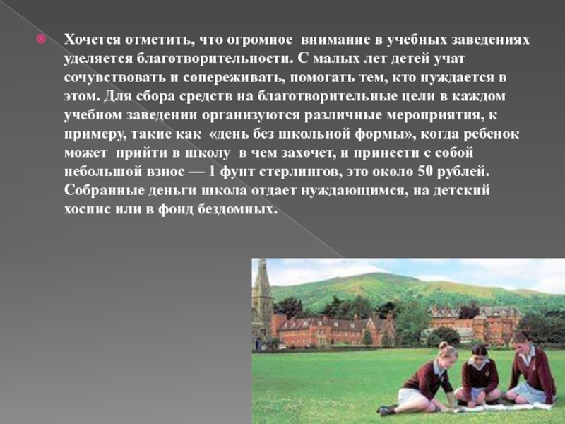 малых лет детей учат сочувствовать и сопереживать, помогать тем, кто нуждается в этом. Для сбора средств на благотворительные цели в каждом учебном заведении организуются различные мероприятия, к примеру, такие как «день без школьной формы», когда ребенок может прийти в школу в чем захочет, и принести с собой небольшой взнос — 1 фунт стерлингов, это около 50 рублей. Собранные деньги школа отдает нуждающимся, на детский хоспис или в фонд бездомных.