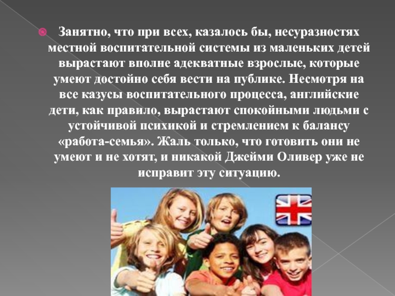 маленьких детей вырастают вполне адекватные взрослые, которые умеют достойно себя вести на публике. Несмотря на все казусы воспитательного процесса, английские дети, как правило, вырастают спокойными людьми с устойчивой психикой и стремлением к балансу «работа-семья». Жаль только, что готовить они не умеют и не хотят, и никакой Джейми Оливер уже не исправит эту ситуацию.