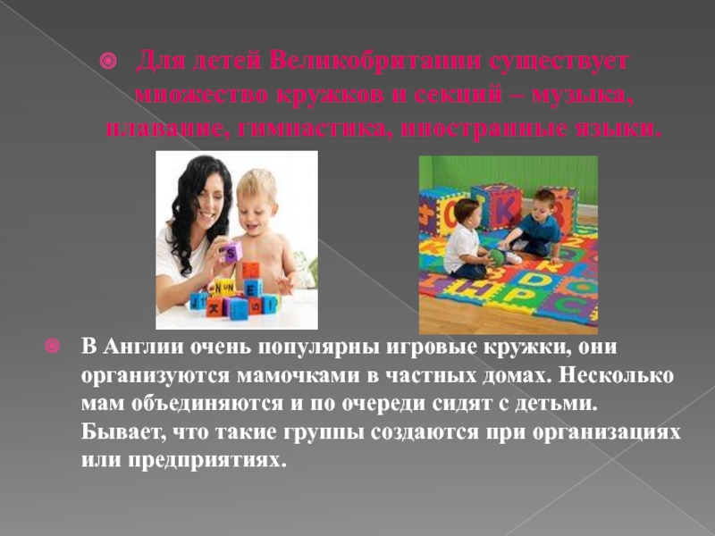 Слайд 4Для детей Великобритании существует множество кружков и секций – музыка, плавание,