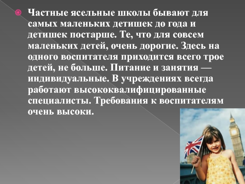 Слайд 9Частные ясельные школы бывают для самых маленьких детишек до года и