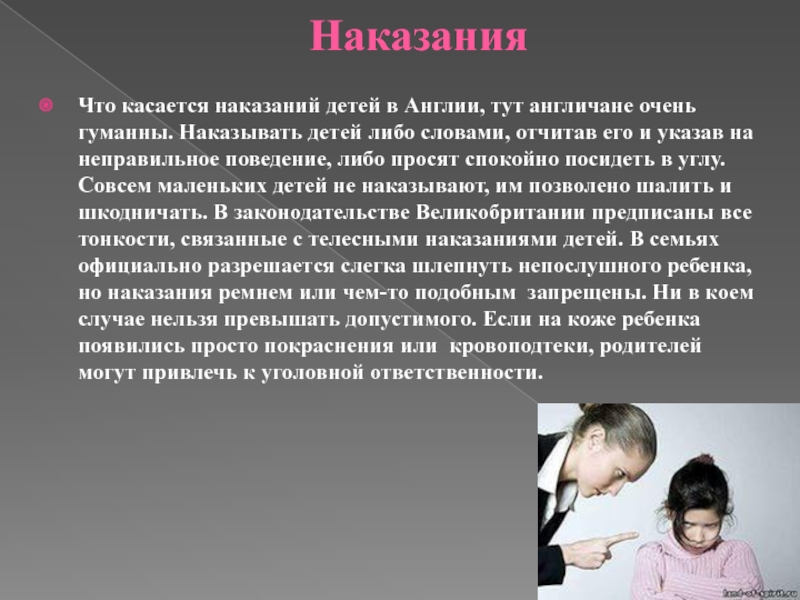 детей либо словами, отчитав его и указав на неправильное поведение, либо просят спокойно посидеть в углу. Совсем маленьких детей не наказывают, им позволено шалить и шкодничать. В законодательстве Великобритании предписаны все тонкости, связанные с телесными наказаниями детей. В семьях официально разрешается слегка шлепнуть непослушного ребенка, но наказания ремнем или чем-то подобным запрещены. Ни в коем случае нельзя превышать допустимого. Если на коже ребенка появились просто покраснения или кровоподтеки, родителей могут привлечь к уголовной ответственности.