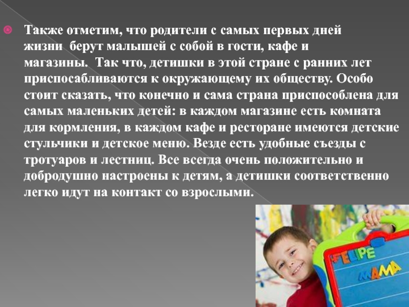 с собой в гости, кафе и магазины. Так что, детишки в этой стране с ранних лет приспосабливаются к окружающему их обществу. Особо стоит сказать, что конечно и сама страна приспособлена для самых маленьких детей: в каждом магазине есть комната для кормления, в каждом кафе и ресторане имеются детские стульчики и детское меню. Везде есть удобные съезды с тротуаров и лестниц. Все всегда очень положительно и добродушно настроены к детям, а детишки соответственно легко идут на контакт со взрослыми.
