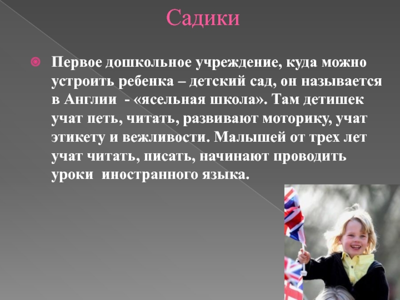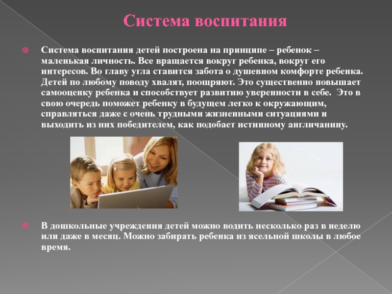 личность. Все вращается вокруг ребенка, вокруг его интересов. Во главу угла ставится забота о душевном комфорте ребенка. Детей по любому поводу хвалят, поощряют. Это существенно повышает самооценку ребенка и способствует развитию уверенности в себе. Это в свою очередь поможет ребенку в будущем легко к окружающим, справляться даже с очень трудными жизненными ситуациями и выходить из них победителем, как подобает истинному англичанину.