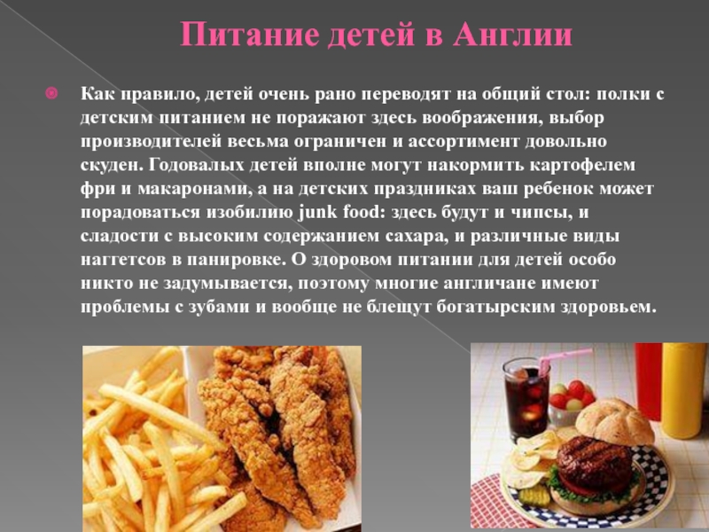 стол: полки с детским питанием не поражают здесь воображения, выбор производителей весьма ограничен и ассортимент довольно скуден. Годовалых детей вполне могут накормить картофелем фри и макаронами, а на детских праздниках ваш ребенок может порадоваться изобилию junk food: здесь будут и чипсы, и сладости с высоким содержанием сахара, и различные виды наггетсов в панировке. О здоровом питании для детей особо никто не задумывается, поэтому многие англичане имеют проблемы с зубами и вообще не блещут богатырским здоровьем.