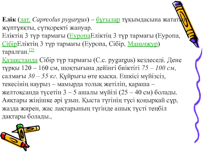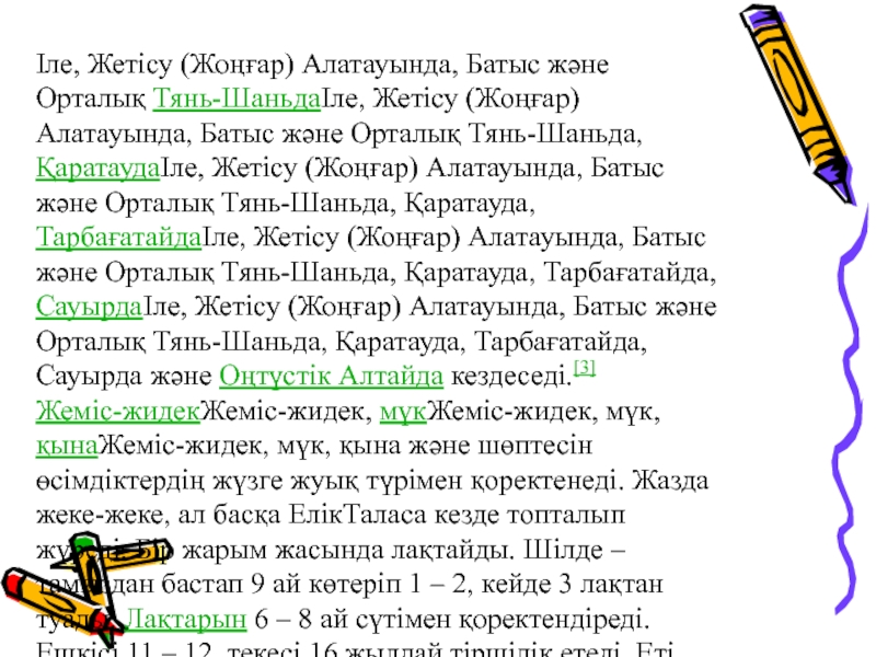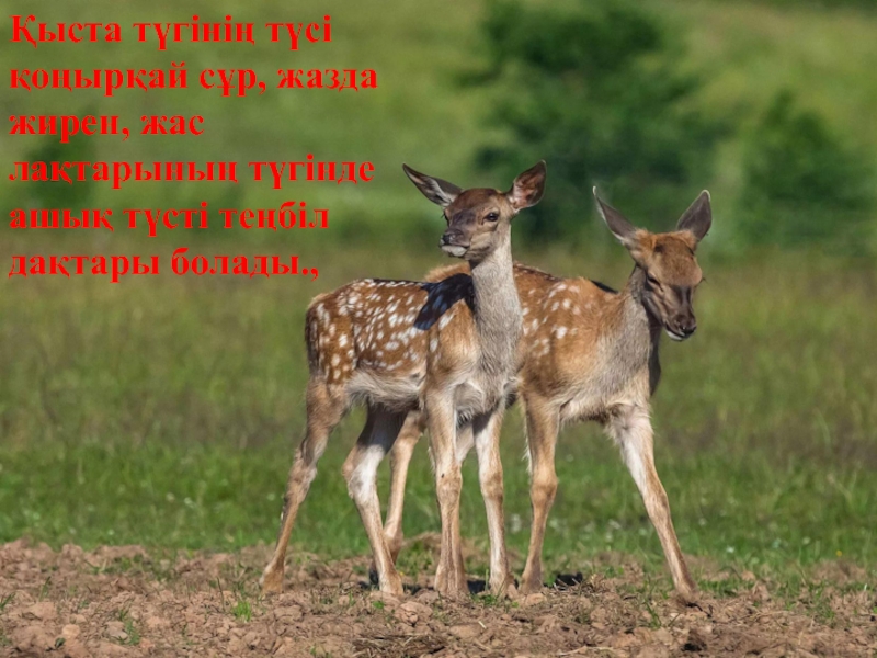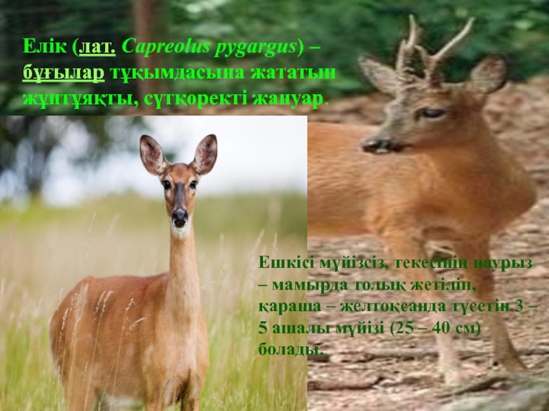 Ешкісі мүйізсіз, текесінің наурыз – мамырда толық жетіліп, қараша – желтоқсанда түсетін 3 – 5 ашалы мүйізі (25 – 40 см) болады.