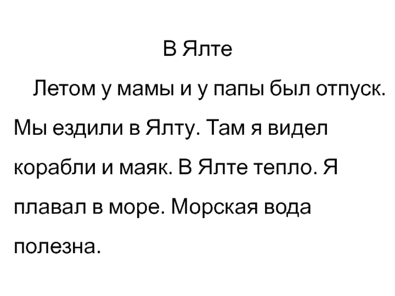 в Ялту. Там я видел корабли и маяк. В Ялте тепло. Я плавал в море. Морская вода полезна.