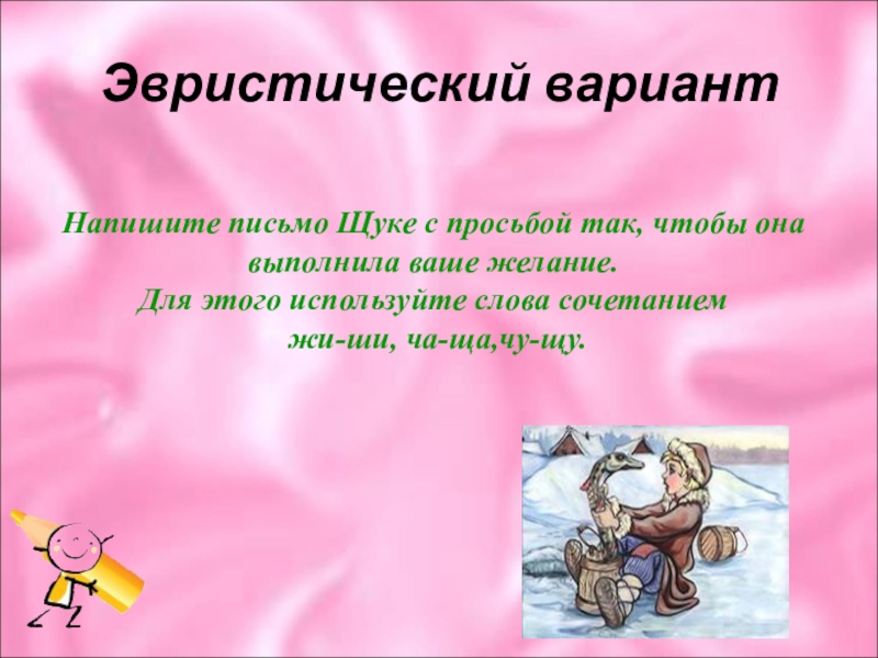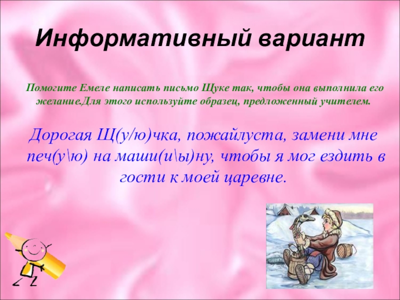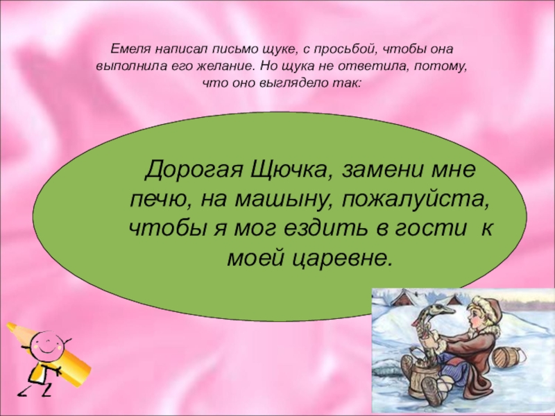 Дорогая Щючка, замени мне печю, на машыну, пожалуйста, чтобы я мог ездить в гости к моей царевне.