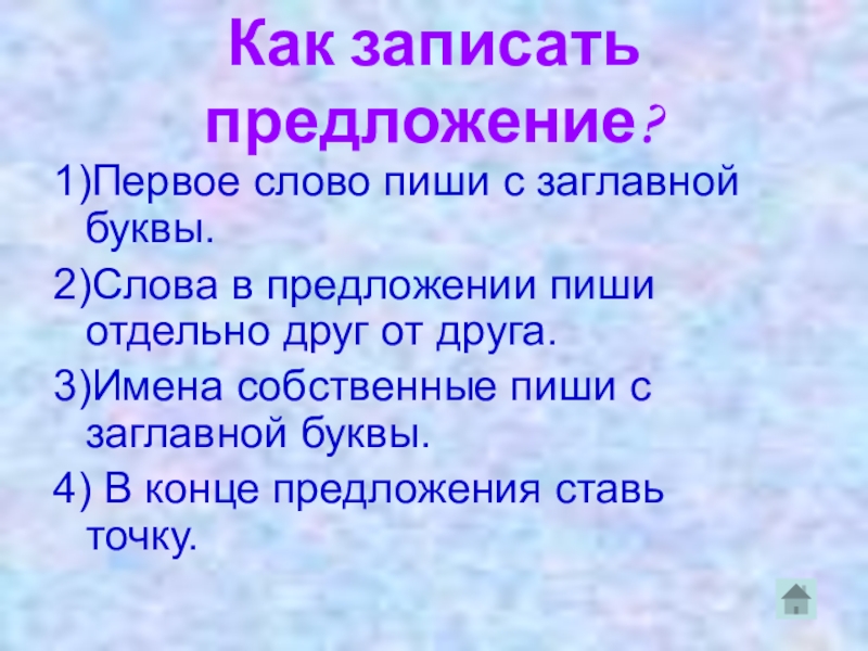 Как записать предложение?1)Первое слово пиши с заглавной буквы.2)Слова в предложении пиши отдельно друг от друга.3)Имена собственные пиши