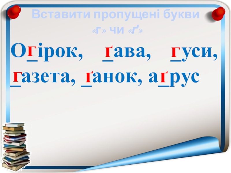 Слайд 2Вставити пропущені букви «г» чи «ґ»
