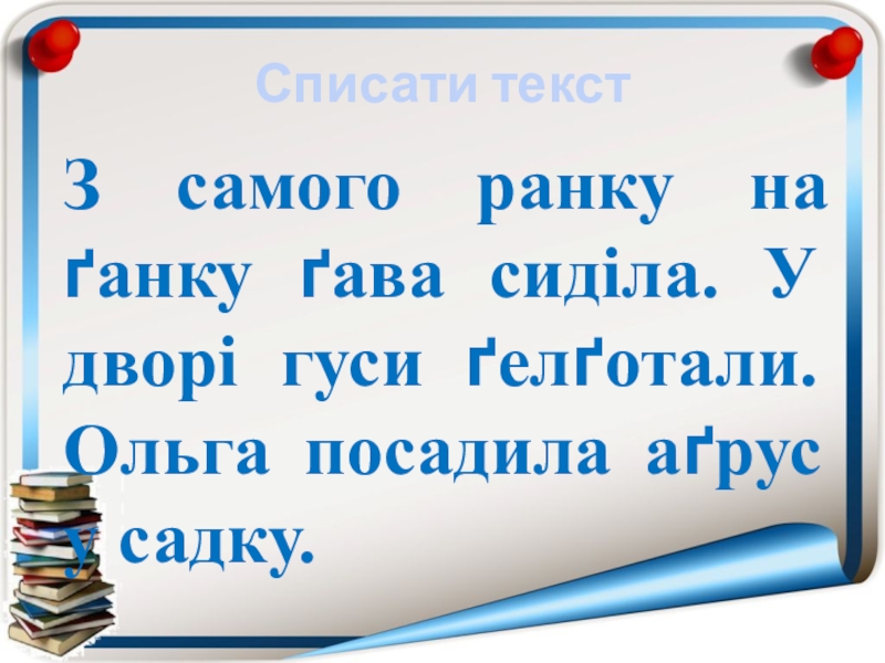 Списати текстЗ самого ранку на ґанку ґава сиділа. У дворі гуси ґелґотали. Ольга посадила аґрус