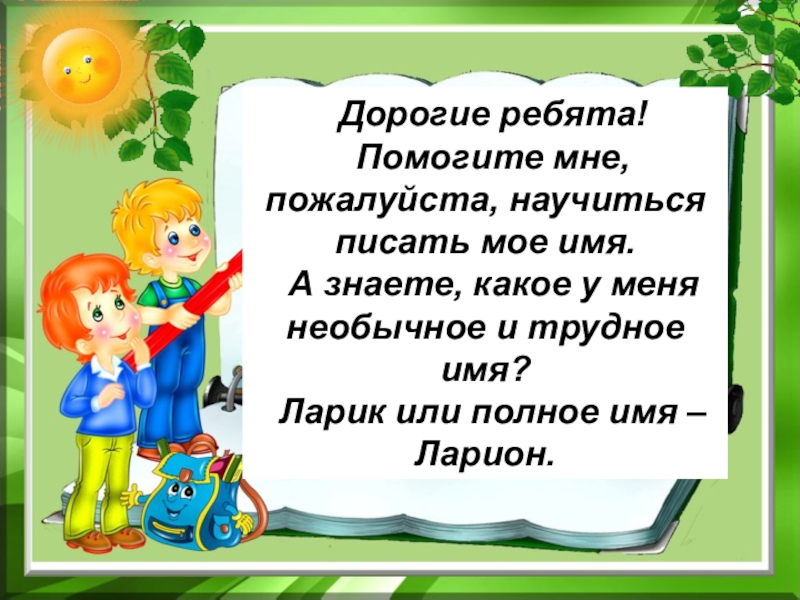 Дорогие ребята!Помогите мне, пожалуйста, научиться писать мое имя.А знаете, какое у меня необычное и трудное имя?Ларик или
