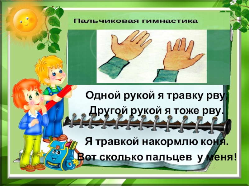 Одной рукой я травку рву,Другой рукой я тоже рву.Я травкой накормлю коня.Вот сколько пальцев у меня!