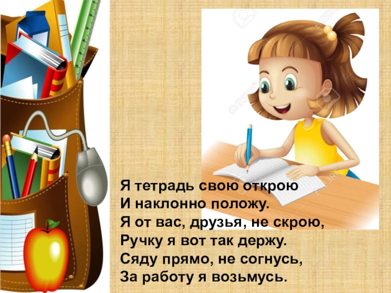Я тетрадь свою открою  И наклонно положу. Я от вас, друзья, не скрою,  Ручку я