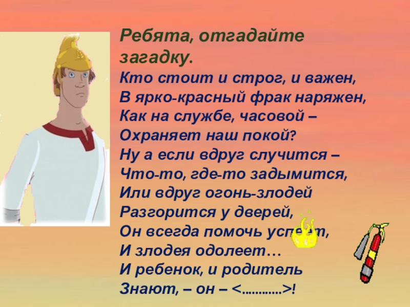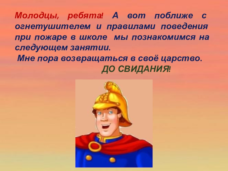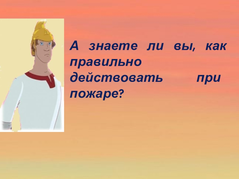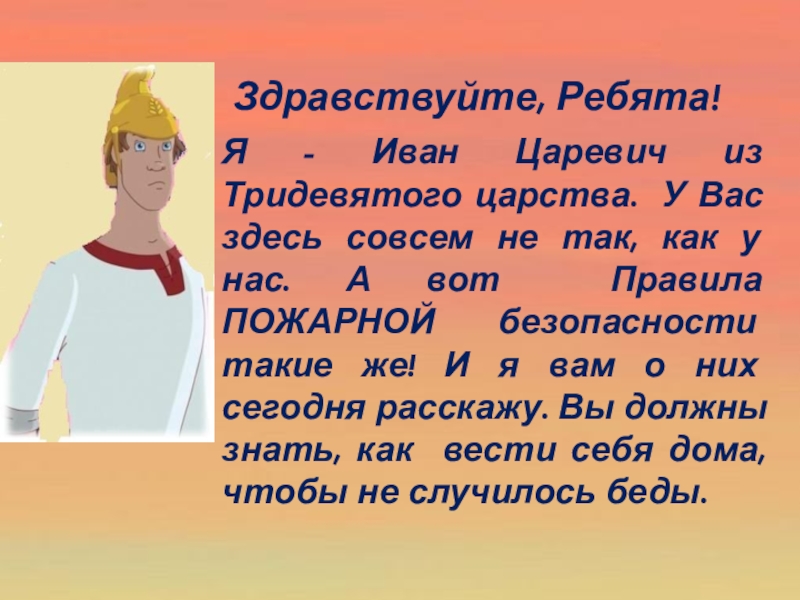 Я - Иван Царевич из Тридевятого царства. У Вас здесь совсем не так, как у нас. А вот Правила ПОЖАРНОЙ безопасности такие же! И я вам о них сегодня расскажу. Вы должны знать, как вести себя дома, чтобы не случилось беды.