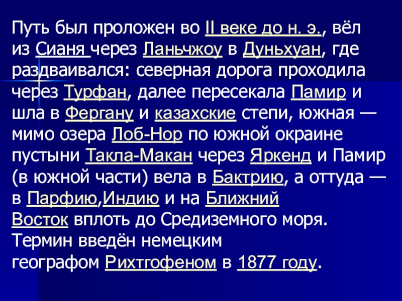 Слайд 5Путь был проложен во II веке до н. э., вёл из Сианя через Ланьчжоу в Дуньхуан, где раздваивался: