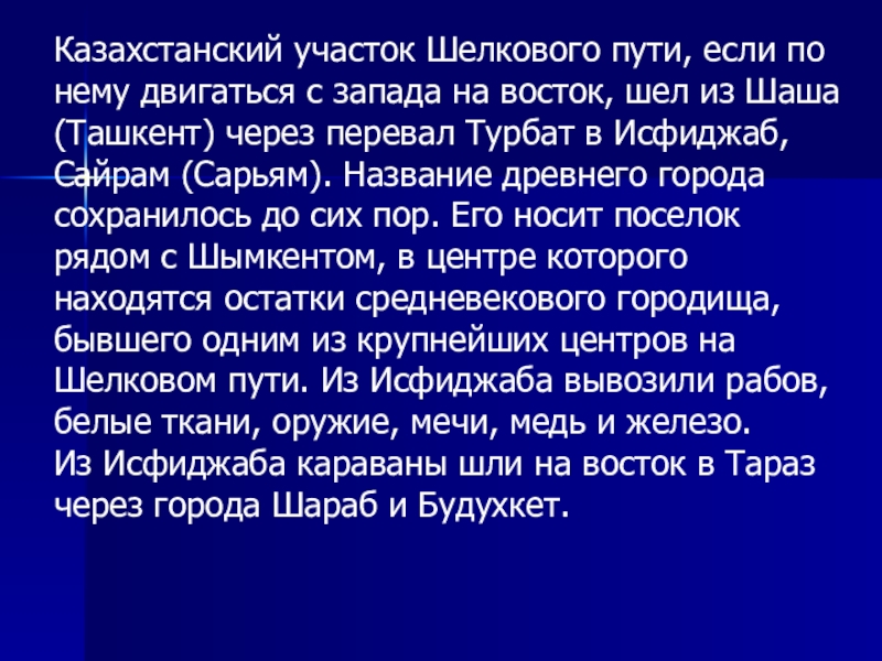 восток, шел из Шаша (Ташкент) через перевал Турбат в Исфиджаб, Сайрам (Сарьям). Название древнего города сохранилось до сих пор. Его носит поселок рядом с Шымкентом, в центре которого находятся остатки средневекового городища, бывшего одним из крупнейших центров на Шелковом пути. Из Исфиджаба вывозили рабов, белые ткани, оружие, мечи, медь и железо.
