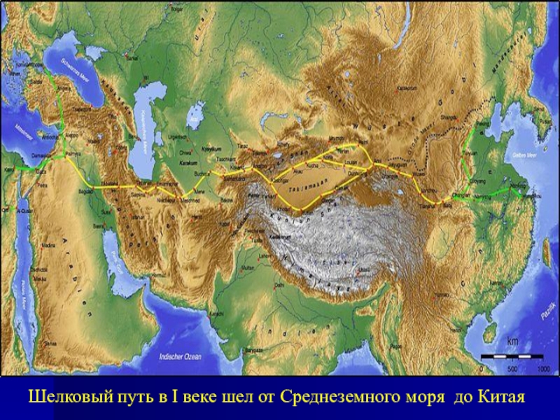 Слайд 8Шелковый путь в I веке шел от Среднеземного моря до Китая