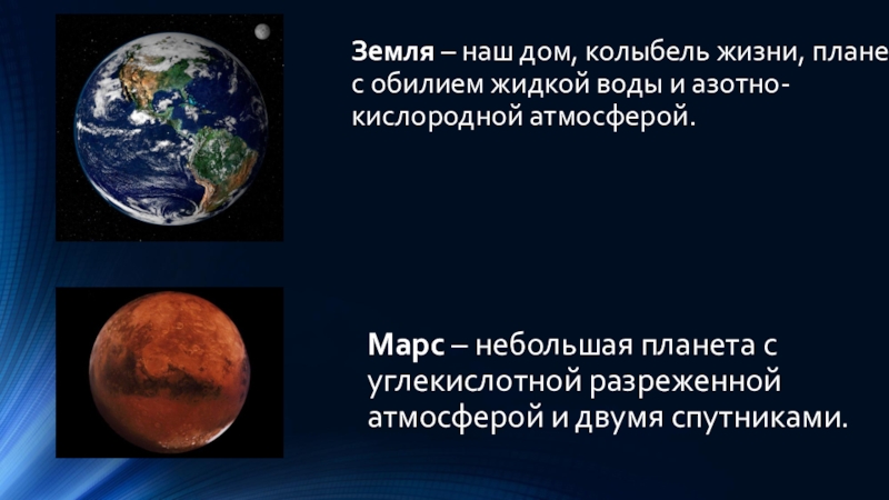 Марс – небольшая планета с углекислотной разреженной атмосферой и двумя спутниками.