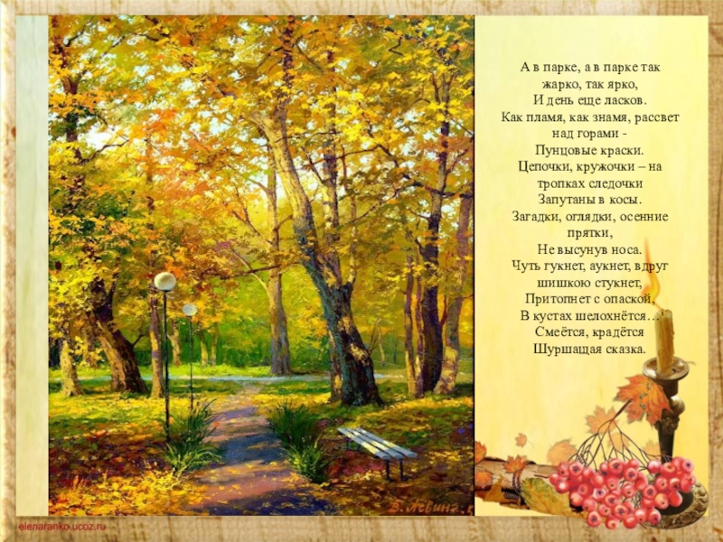 тянуть ее в хоре, старательно вытягивая тоненькую шейку, потому что всю весну и все лето, на ярком солнце и под дождем, лист учился шуршать и ждал, когда вы придете, ранней осенью, послушать его торжественное выступление. Он даже нарядился в лучший парадный костюм – чтобы среди хора соседей, его голос не потерялся и был вами отмечен.
