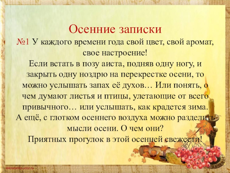 Если встать в позу аиста, подняв одну ногу, и закрыть одну ноздрю на перекрестке осени, то можно услышать запах её духов… Или понять, о чем думают листья и птицы, улетающие от всего привычного… или услышать, как крадется зима.