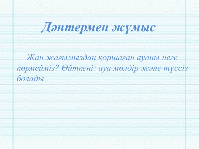 Жан жағымыздан қоршаған ауаны неге көрмейміз? Өйткені: ауа мөлдір және түссіз боладыДәптермен жұмыс