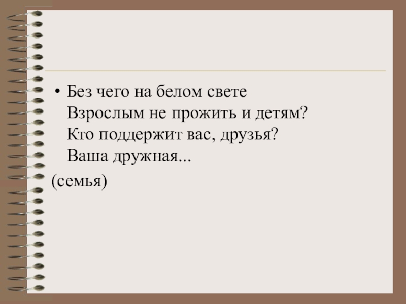 Без чего на белом свете  Взрослым не прожить и детям?  Кто поддержит вас, друзья?  Ваша дружная... (семья)