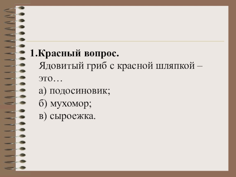 1.Красный вопрос.  Ядовитый гриб с красной шляпкой – это…  а) подосиновик;  б) мухомор;  в) сыроежка.