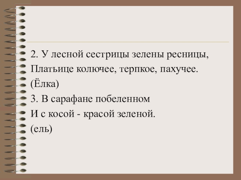 2. У лесной сестрицы зелены ресницы,Платьице колючее, терпкое, пахучее.(Ёлка)3. В сарафане побеленномИ с косой - красой зеленой.(ель)