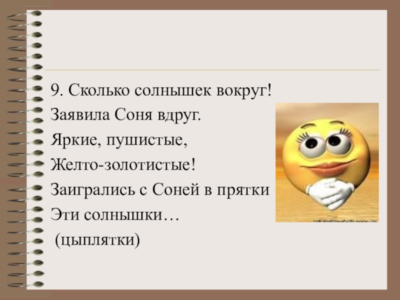 9. Сколько солнышек вокруг!Заявила Соня вдруг.Яркие, пушистые,Желто-золотистые!Заигрались с Соней в пряткиЭти солнышки… (цыплятки)