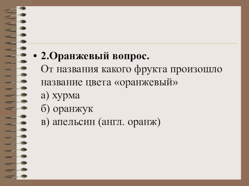 2.Оранжевый вопрос.  От названия какого фрукта произошло название цвета «оранжевый»  а) хурма  б) оранжук  в) апельсин (англ.